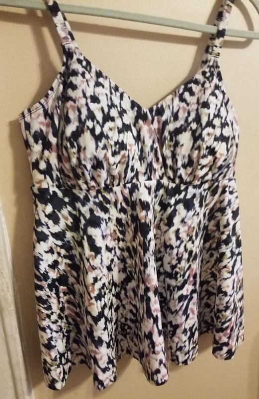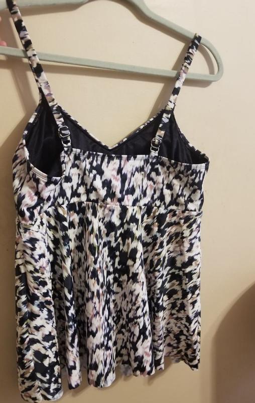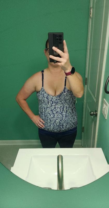 Comfortable tankini top that is stylish with a supportive attached bra. I was happy with the fit and will be wearing to the pool this summer! This would be flattering for many different body types due to the blouson-style hemline.