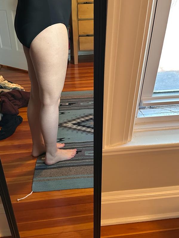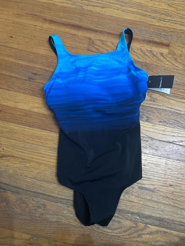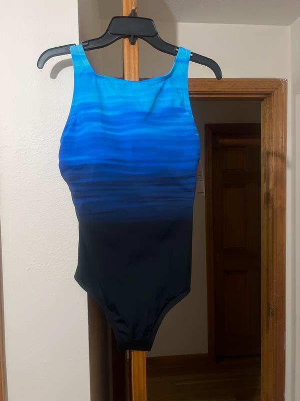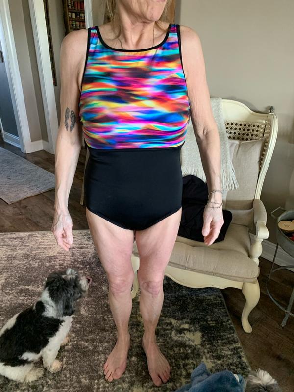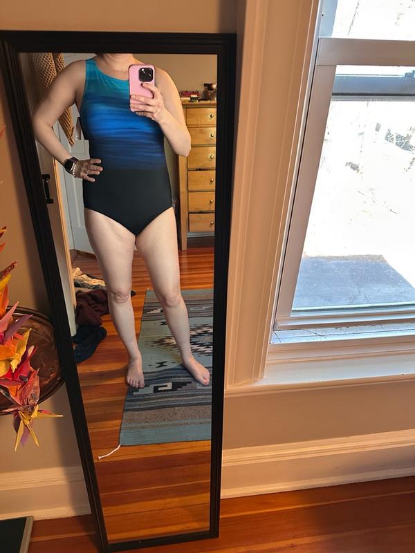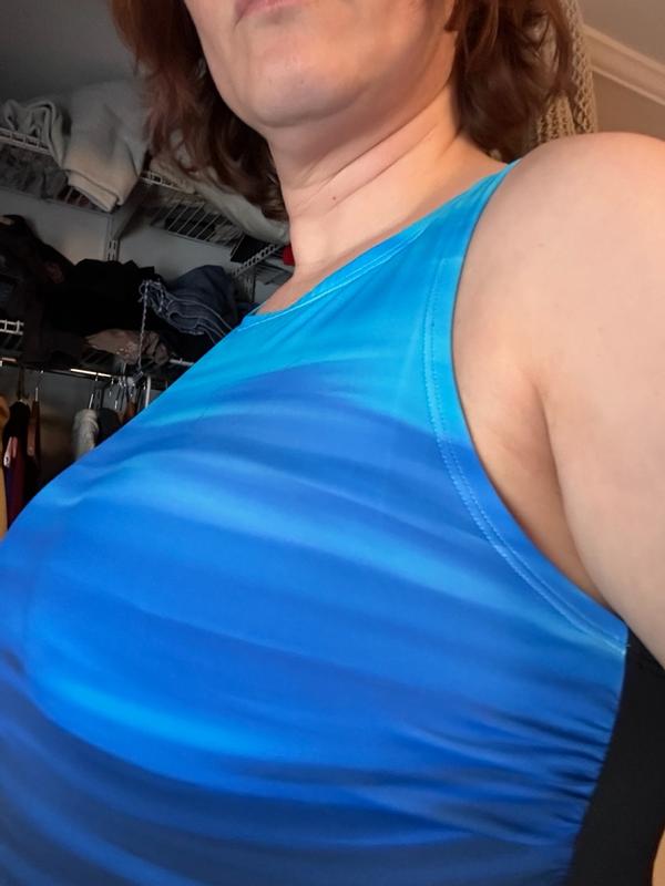 I usually wear an 8-10 in clothing so I got a 12 in this suit. It felt supportive and thick, so not every bump & lump showed! The high neck is definitely good for playing in the water with my kids and the seat covers a lot, maybe a little too much as to look matronly? It’s a great suit for athletics though, as it was very supportive for my larger chest and definitely holds you in.