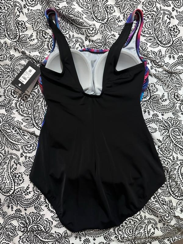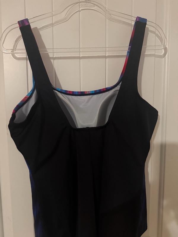 I received this Shape Solver Sport Scoopneck Tank one piece swimsuit and it’s so pretty in person! The swimsuit is a performance style- one piece swimsuit and has a black and colorful pattern. The quality is superb and really holds its shape when you wear it. The swimsuit features a built- in bra and is a slip- on style. There are no adjustable straps but there is plenty of room and is very flattering for a parent. The weight of this weight is minimal and features very good support for women that prefer a modest swimsuit. This swimsuit is a great value and has a nice feature of chlorine resistant fabric which is a bonus for those that swim a lot. I also appreciate this swimsuit is UPF 50 protection from the harmful sun. In addition, this swimsuit features an anti- bounce bra which is a great feature to a swimsuit. Overall, I highly recommend this Shape Solver Sport swimsuit to others looking for a comfortable, modest swimsuit.