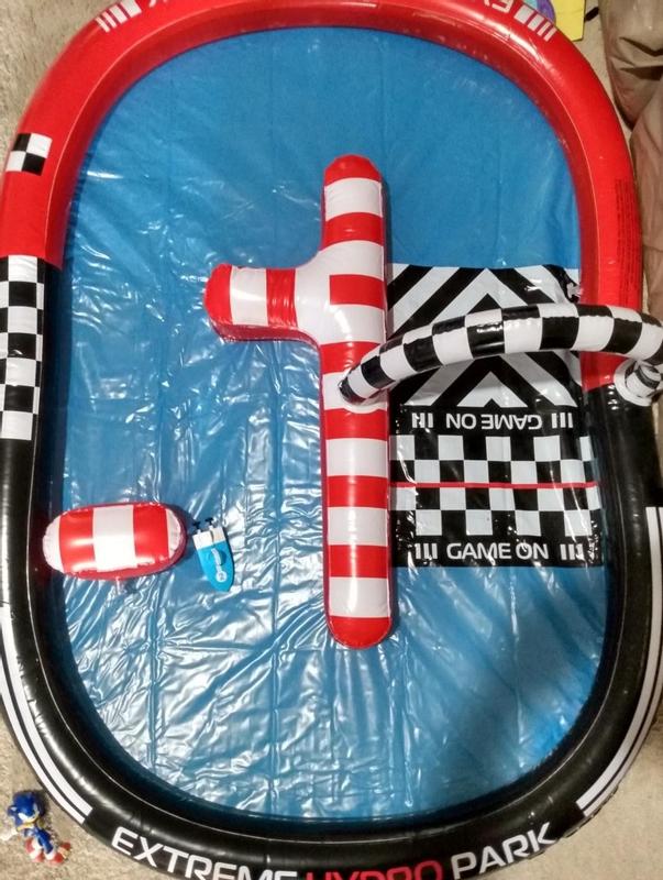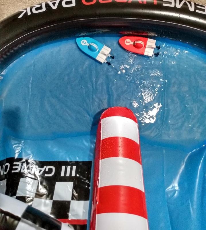 The pool size is 3 feet x 4 feet, which fits on both our wood picnic and our glass patio table. We took the set to our local park several times, setting up on a plastic tablecloth covering a picnic table (to avoid splinters), and were quickly surrounded by other adults and youngsters watching and then taking turns playing with much good-natured laughter and teasing. A rechargeable battery is included for each of the two brightly colored boats. We merely needed to add our own 8 AA batteries, 4 for each remote control. Use the remote controls to recharge the boat batteries or charge them from wall outlets. Using the remote to charge the boat batteries is especially convenient when we are playing in a remote location like a park or campground. Blowing up the pool is simple and quick, which makes it easy to set up for hours of play and then deflate and store to play again another day. It is a fun and lively challenge to move my boat around the track while trying to find the right speed to create enough wave to throw my opponent off course while avoiding my opponent’s waves and still staying on course. The pool, boats, and accessories are well designed, sturdy, easy to deflate and dry for storage between uses. Hydro Racers is a very enjoyable addition to our game shelf.