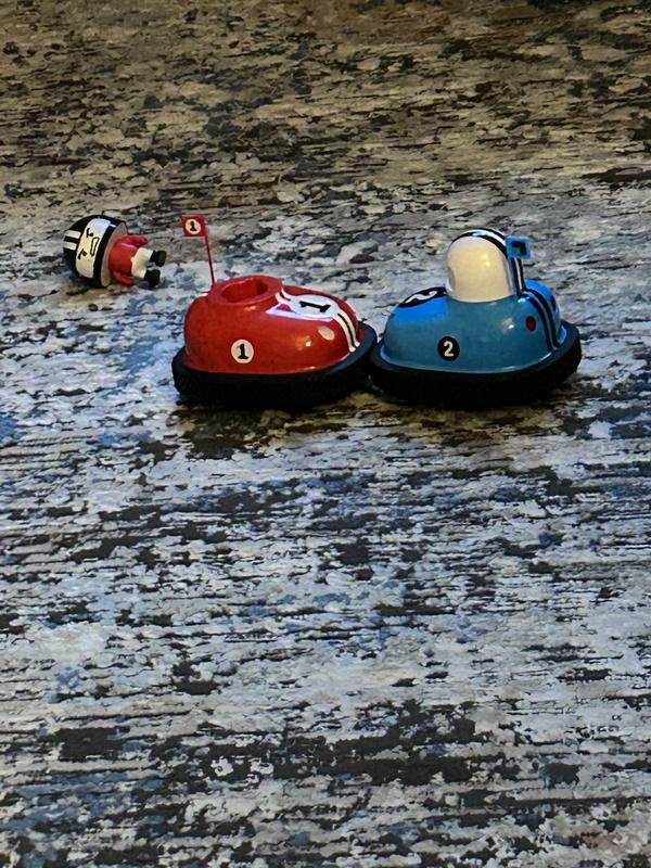 These two cars take a TOTAL of 10 AAA batteries which I think is too many! When pairing the remote with the car- the controllers paired with the wrong color and we couldn’t figure out how to fix. After about 4 minutes of bumper play that wasn’t too rough at all, one car was bumped too fast and an inside gear seems to have gotten bumped off track and you can hear it moving inside but the wheels no longer turn.