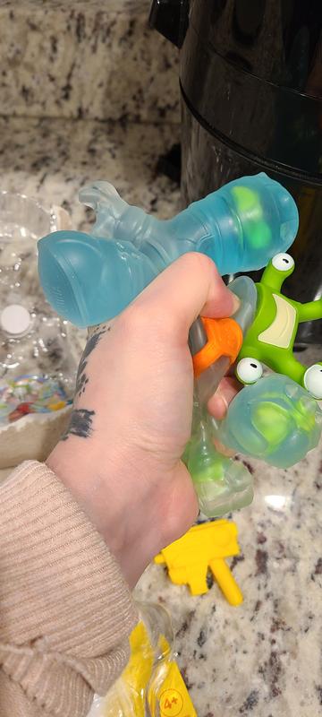 This is such fun toy to that the kids can play with for hours. It's squishy, stretchy and bouncy. The small water gun adds a nice touch. I like being able to see inside the body and the pieces floating in it. It's great for kids to play with and also for adults to use as a stress reducer.