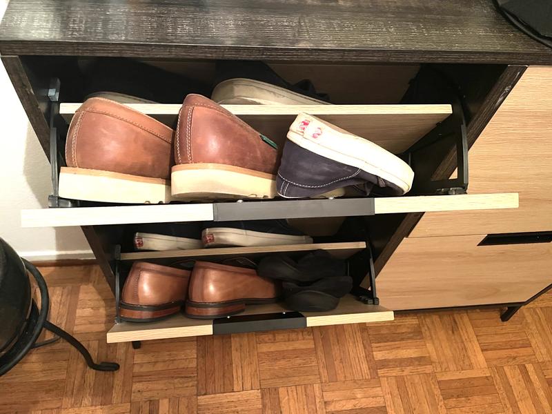 1. Pictures are lying! FALSE ADVERTISING is a fraud! It should not be sold on Macy's website. PURPOSELY putting pictures that LIE! 2. Very bad quality. Hole do not match all four drawers. Once it's in it damages side panel. 3. Pictures are showing "Barbie shoes". If you put it together, it will hold 3 shoes in each drawer.