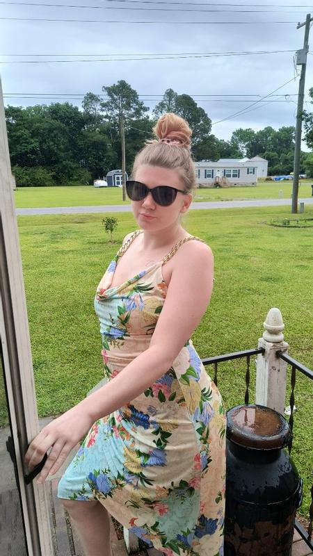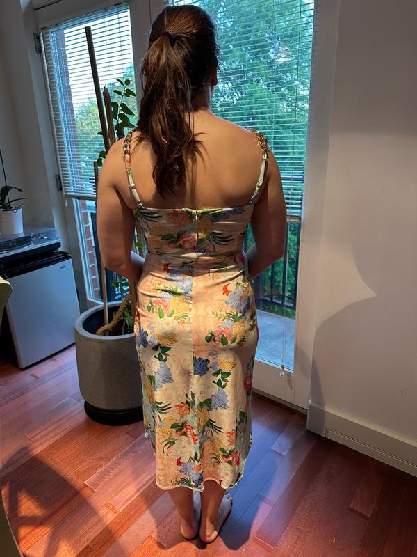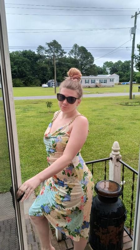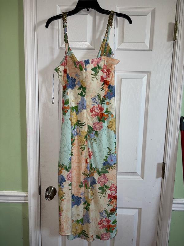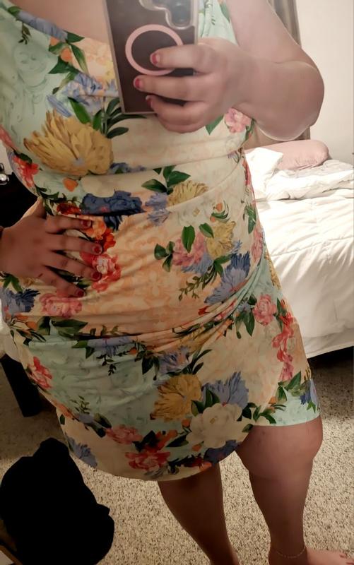 This dress looks beautiful on BUT the gold chain straps are so cheap looking I took it back. Bought it in two sizes, both fit because the dress have nice stretch and the ruching hides your belly yet give a nice shape. The gold chain straps are only in the front and they just ruin the dress for me. Personally I think it’d be a perfect dress if the straps were different. Just couldn’t get past the chains so I returned.