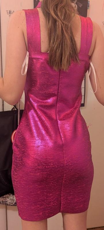 The dress itself is cute and well constructed, seems like good quality, but I couldn’t get it up past my hips and I wasn’t expecting the color of the dress to look more metallic than anything.