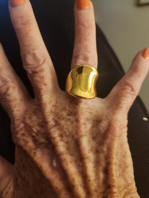 Although I appreciates the size and shape of this ring, I was still underwhelmed by it. I will wait until a solid gold ring of this shape is available and purchase that instead.