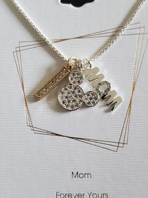 Silver Plated Mickey Mouse "Mom" and Clear Crystal Bar Charm Necklace, 16"+2" Extender