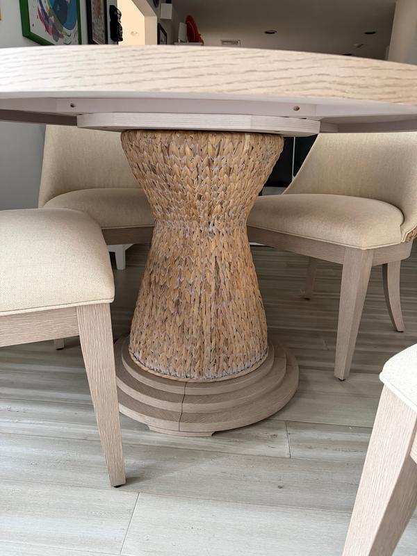 This dining set is absolutely beautiful and incredibly comfortable. The chairs are wonderfully supportive with just the right amount of cushioning. The upholstered seats and curved backs are perfect. They feel sturdy yet soft. The table itself has a gorgeous, clean look. The light wood finish gives it a fresh, airy feel that brightens the entire space. Its round shape makes it inviting and perfect for gathering, while the solid construction feels durable and well-made. One of the standout features is the woven pedestal base. The weave detail adds warmth and a natural, coastal-inspired charm that elevates the entire design. It ties beautifully with the woven chair backs, creating a cohesive and thoughtfully designed set. The pedestal base also makes seating easy and comfortable with no awkward table legs in the way. Overall, this set combines style, comfort, and craftsmanship perfectly.