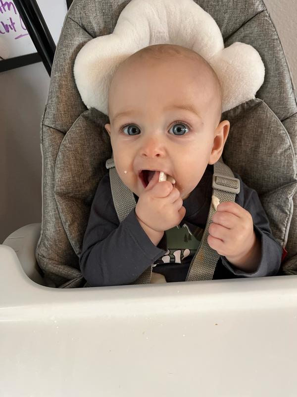 Got this for my 4 month old since he's on the bigger side and my mother needed help feeding him. Most chairs start at 6 months so I'm happy that this option existed. Everything is great from the sturdiness and ease of folding and putting off to the side. Two cons: - The attachable plastic cover on the tray has sharp edges and ended up cutting my baby's belly when we first used it. We had to sand the edges down, but other than that. The rest was great. - The harness clips are secure, but difficult to unlatch.