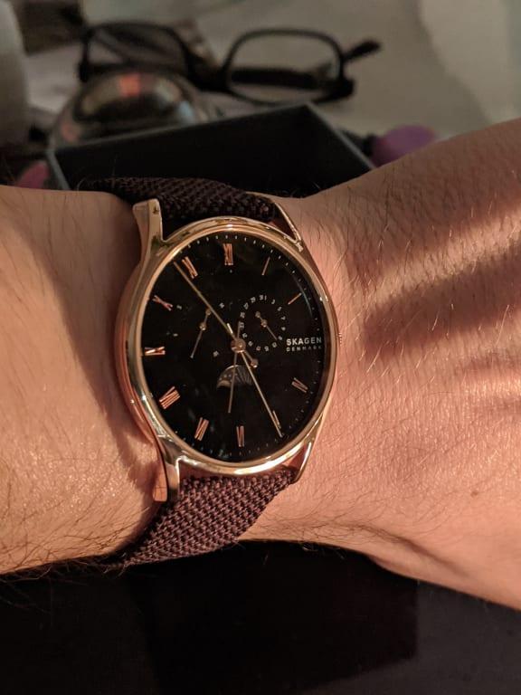 This is my second Skagen. I first fell in love with the Signatur when I got it as a Christmas present from my mother last year. I decided to buy the Holst Moonphase because I love the look, and the complication. The rose gold case looks wonderful and the brown nylon strap is so comfortable. Now, a Moonphase isn't the most practical complication to have, but it is certainly one of the coolest! The calendar works perfectly too; It's dead on and is so practical. This is a beautiful watch that works wonderfully well, looks great, and above all is so comfortable! I love the Holst Moonphase. It's a great watch that I look forward to having in my collection for a long time to come. It certainly won't be my last Skagen!