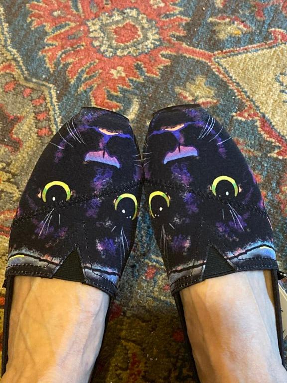 I kept seeing this shoe on other cat-loving women and wanted a pair for myself. Basically, I wear clothes that are attractive and comfortable. These cat-faced shoes fit that description and complement most of what I wear. They are also light-weight and fit well. I love them.