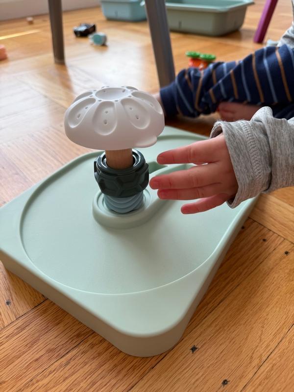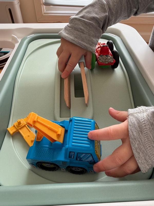 This is a grow-with your child sensory toy by skip hop. This toy is very easy to assemble - just pop in the adjustable legs and it’s ready to go. For a child around 18 months, the toy can be used without the legs as well. It comes with two sturdy, colorful, plastic bins with lids and a few toys inside. The legs angle externally for more stability. It’s not designed/ intended for sitting but the directions say it can accommodate 100 lbs in case your have a rogue child that insists on sitting on it. The bins are completely detachable for easy washing and cleanup. The bins have trays that fit inside on either side, and lids that fit on top. One of the trays has a ramp that invites you to bring your own small cars (not included) in for play. There are spaces for the toys - a slot that fits the wooden roller (included), which fits in the 3 assorted size/color wheels (included), a few scoops, a “mushroom” dome that fits, tweezers, and a few other things. The lid flips over and would accommodate duple-sized legos (not included). My 22 month old had a blast. He used it with the table legs but also removed both bins and played on the floor. I demonstrated the ramps and we used our own cars to play - he had a huge giggle every time the car went down the ramp. I showed him how to use the roller and he was spinning it all around. He played for a solid 15-20 minutes when we first set it up. We haven’t yet experimented with the water, sand, or other sensory items yet but you can see that it’s versatile and that it would be a lot of fun. The plastic looks durable and overall, the product is designed to store the items it came with. This will be good for imaginative and sensory play in the months ahead. Disclaimers: 1) The cars pictured are my own. 2) I reviewed this product for my honest opinion.