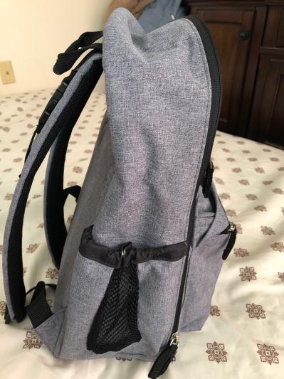This diaper backpack has everything you could need and plenty of space. It looks enough like a regular backpack that you could use it beyond diapering needs and my husband loves wearing it too! I appreciate the main compartment zipper goes all the way to the bottom of the bag for easy access to things deeper in the bag. The side pockets are also very spacious and fit even a large water bottle