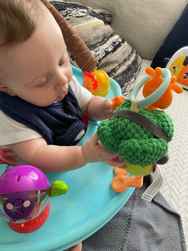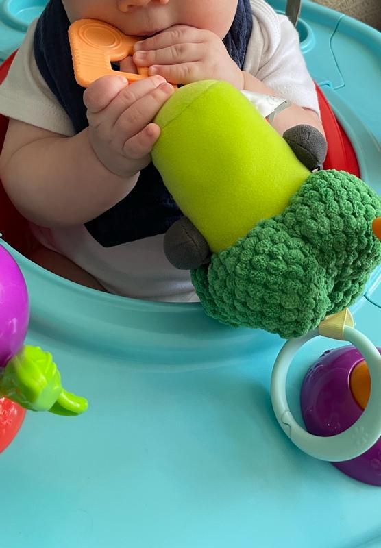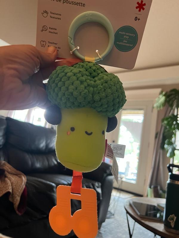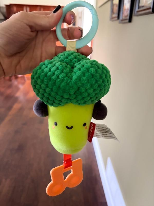Baby loves Mr. Broccoli! It has a nice soothing jingle and the plastic musical note is easy for baby to grab. The loop allows it to hang from a stroller or activity set. Maybe it will convince him to enjoy veggies one day!