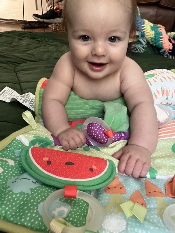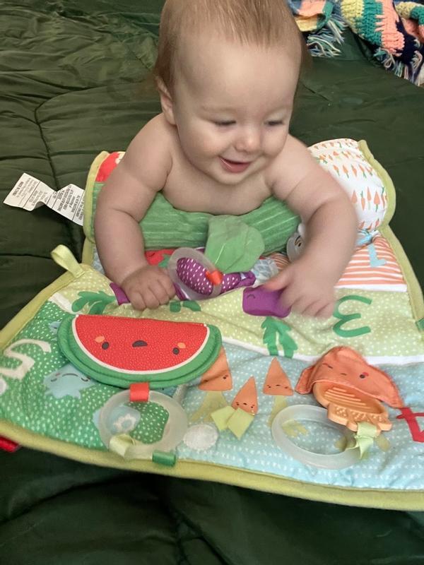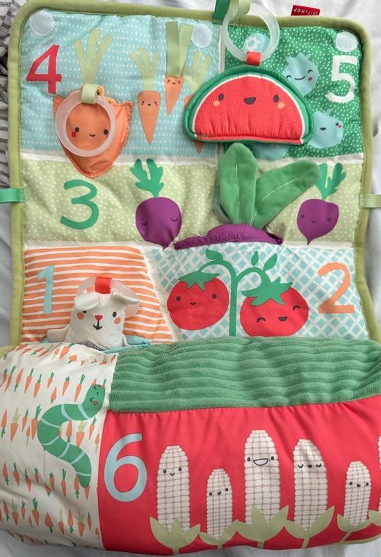 I love playing with my baby on this mat. It makes tummy time more fun for her and she enjoys the cute rabbit and radish toys. It’s very adorable. And the toys are big enough to not cause a choking hazard. Very safe so far.