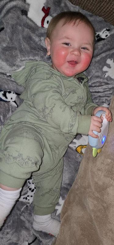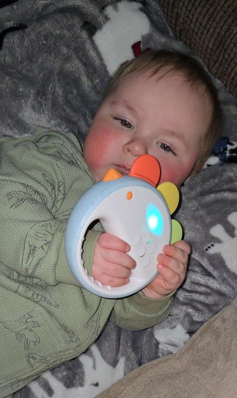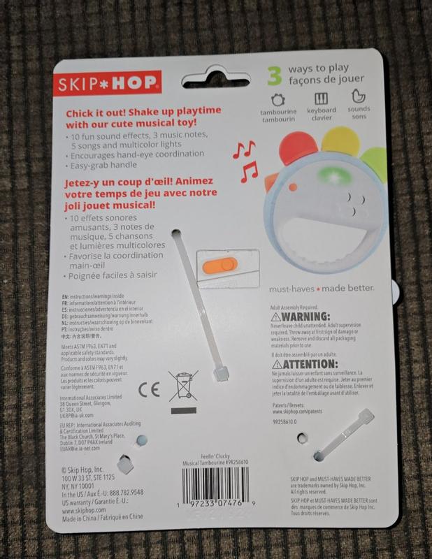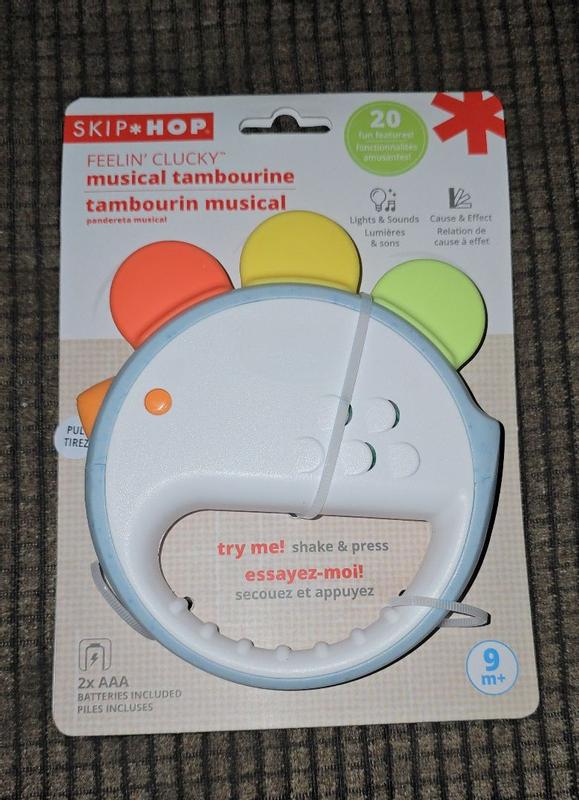 The Feelin’ Clucky Tambourine is an adorable, durable, baby toy. It has multiple modes for babies to explore including chicken noises, songs, and even a piano mode! The sound quality is solid and it’s easy to use. My baby loves the colored lights and how easy it is to press on the chickens comb to make the noises. It’s survived several throws across the room and the slobber from a teething little one. Overall 10/10.