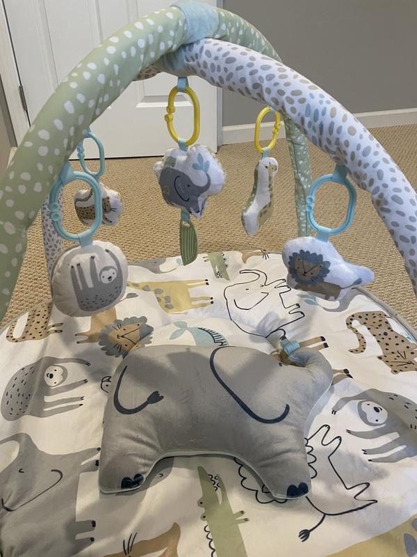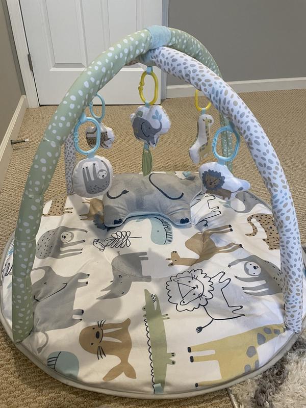 This is a great little play gym. It is soft and comfortable for a baby to lay on and get tummy time or play time on. There is an elephant pillow to help hold their head and support. It comes with the 2 arches used to hang the toys on, which can later be removed for older babies who want to sit and play on the mat. The toys are cute, all safari themed and squeak, rattle and make noise for great entertainment. I like that the gym is neutral color so that it can be used for either a boy or girl, or saved for another baby later on. Overall It’s a great quality play gym that is easy to assemble.