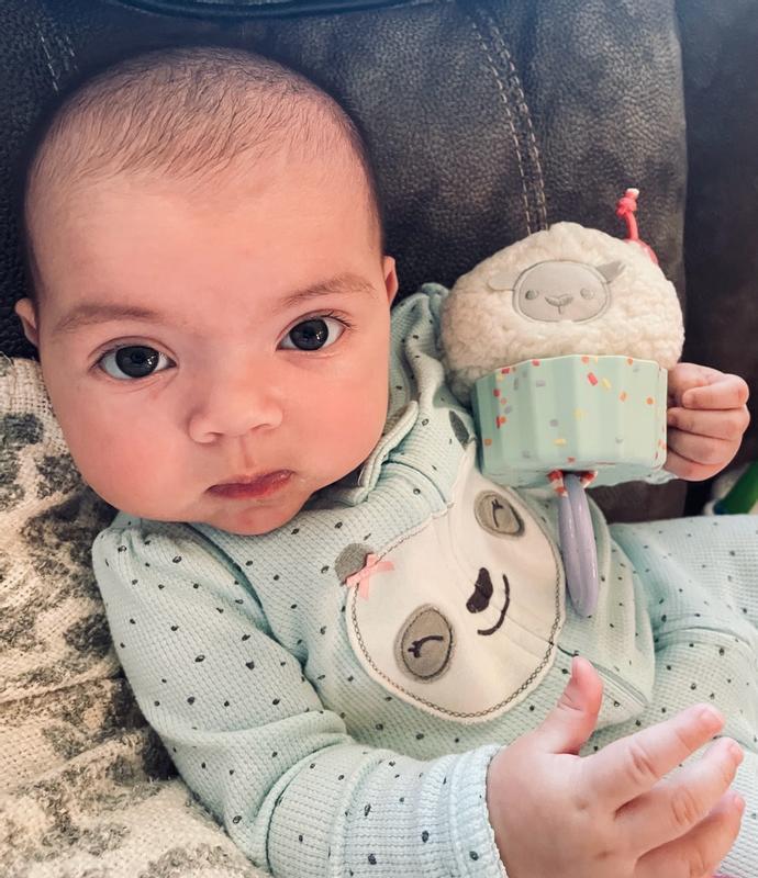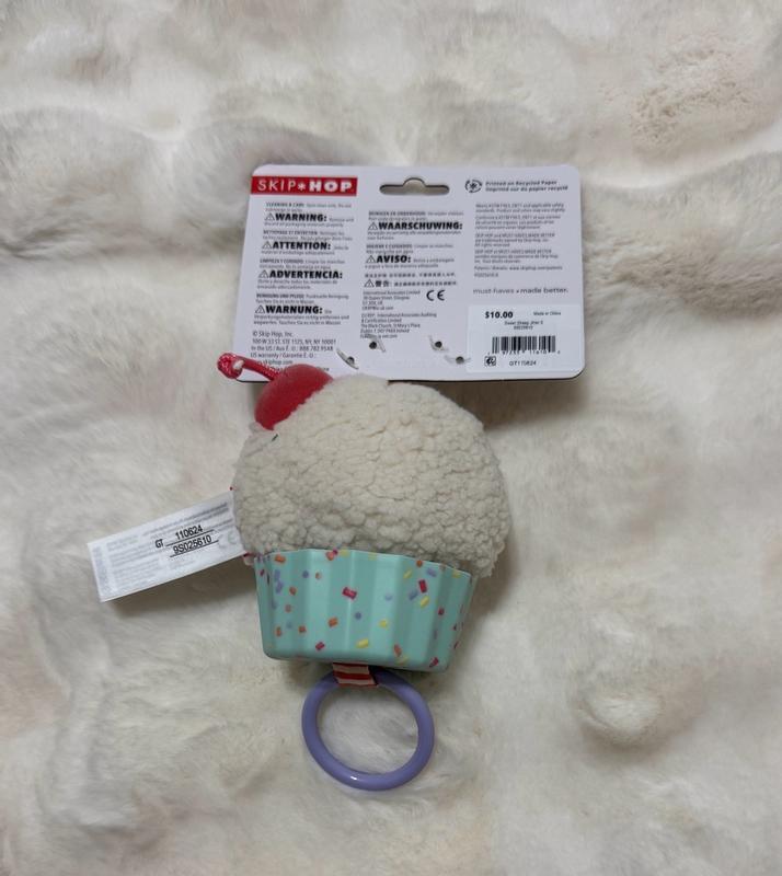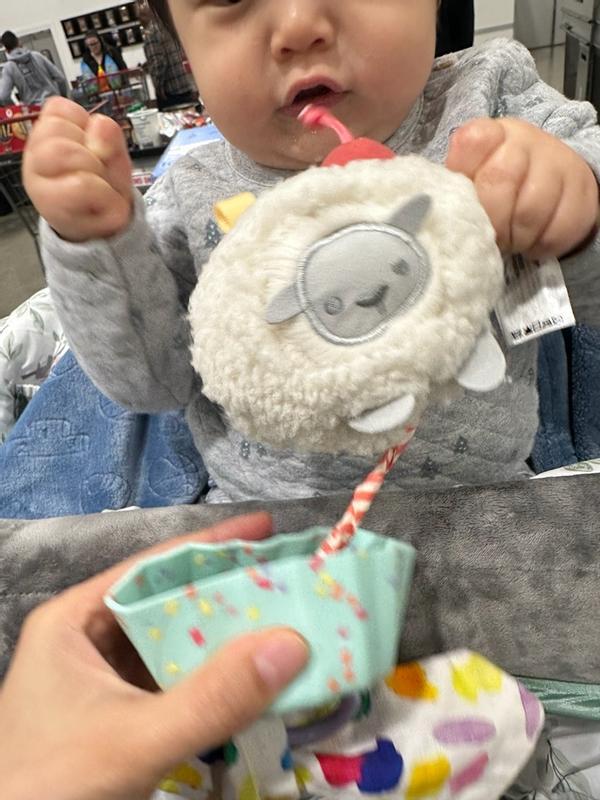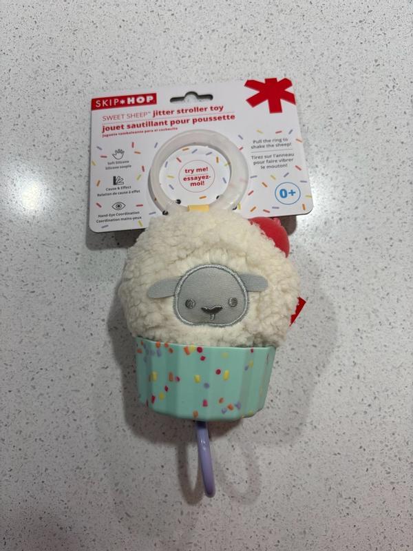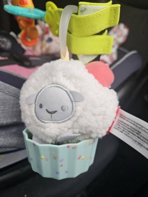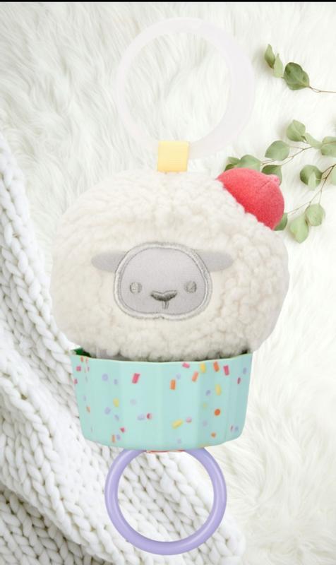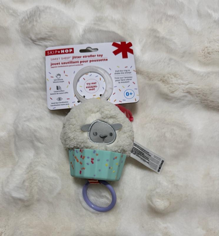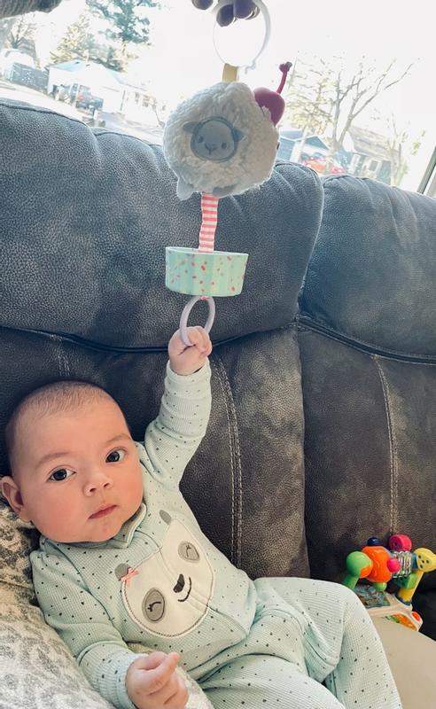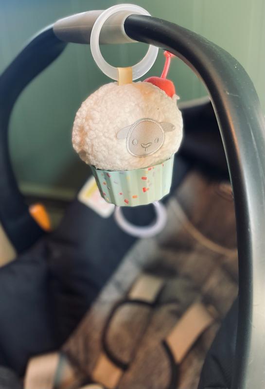 Cute interactive toy easily clips on to wide car seat handles, for portable entertainment. It also is a great sensory toy with a soft rubber base, fluffy soft top with a stitched on sheep face and cherry on top. No choking hazards make this a safe toy to leave in you little one’s hands. And the pull down string with ring is great for strengthening grip, the added vibrations as the string retracts make for a fun surprise. The price is fair for what you get, after a month of use I would highly recommend this product. The quality is great.