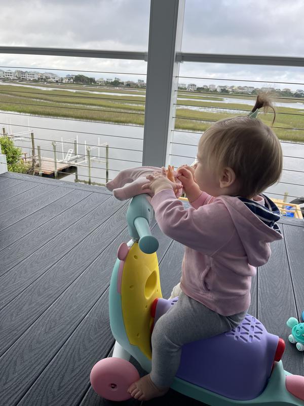 This is the best thing that I have bought for my daughter! She absolutely loves riding along, pushes to walk and is close to walking on her own because of this scooter. We will get a lot of longevity out of it, too. The three stages work exactly as described for babies learning to walk. Also, we have dance parties to the music. The tunes are MUCH better than other brands’ music, which can be loud and abrasive. While the songs do get stuck in your head, they are much more pleasant to hear on repeat. I cannot say enough good things about this scooter! The only request I would make of Skip Hop is to give us a four song rotation instead of two. 😉