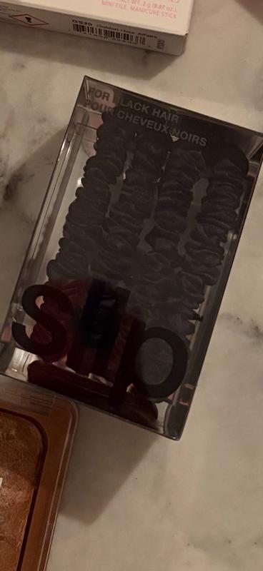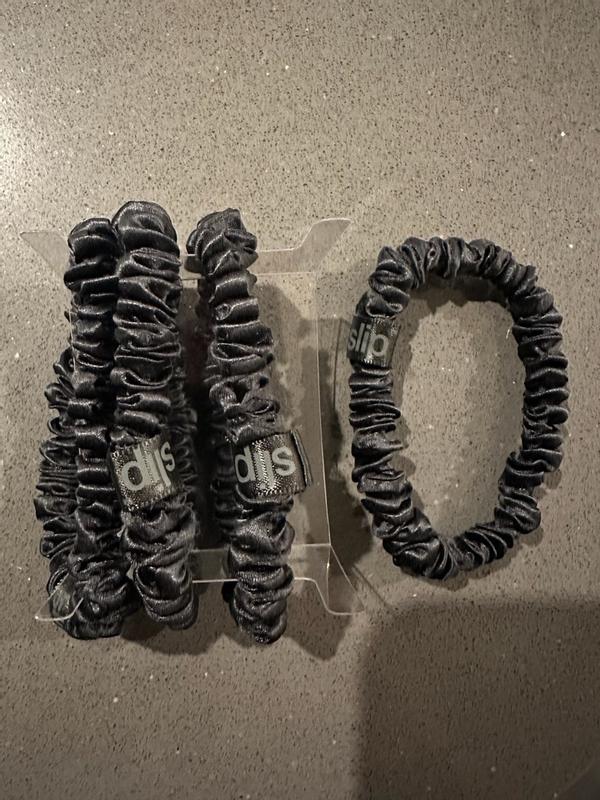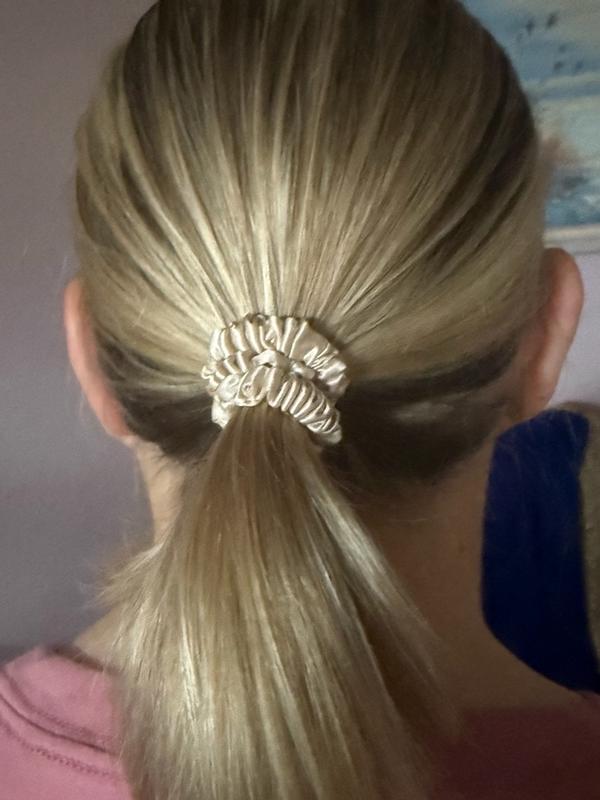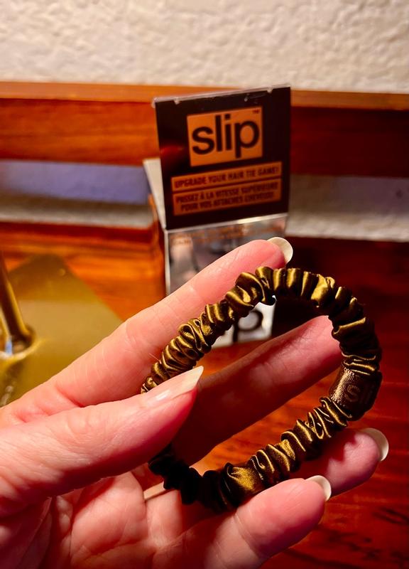 This is the perfect size hair tie and it stays on without slipping. The silky material is gentle on my hair.