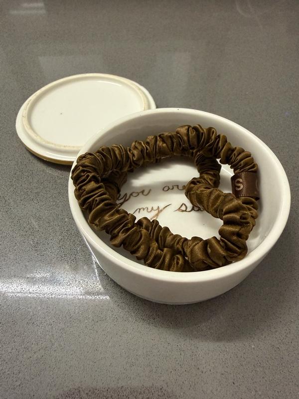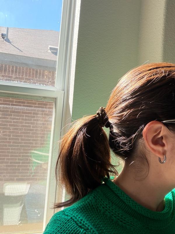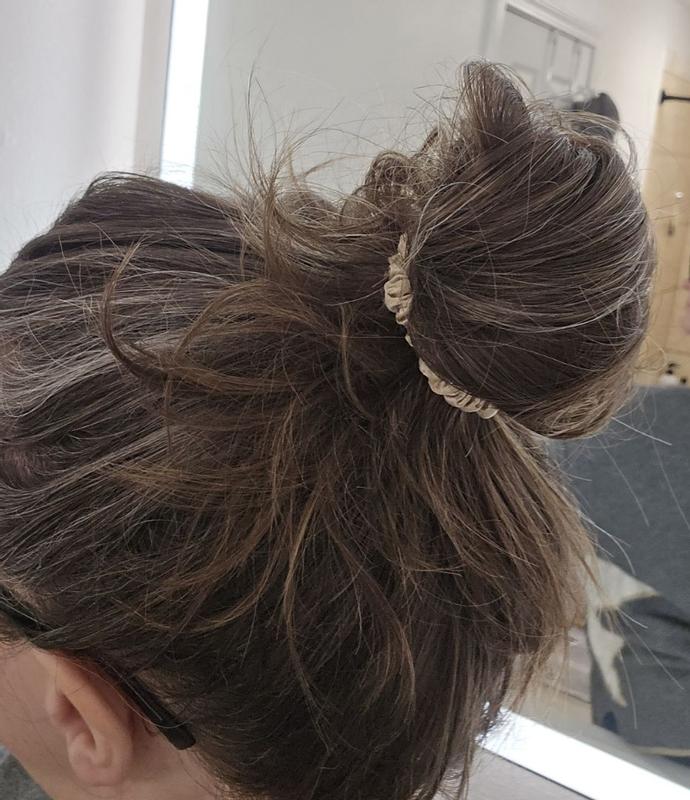 Love the color, texture and size of this scrunchies. Works perfectly when I need to do a pony tail but because is skinny it doesn’t show as much as the regular ones.