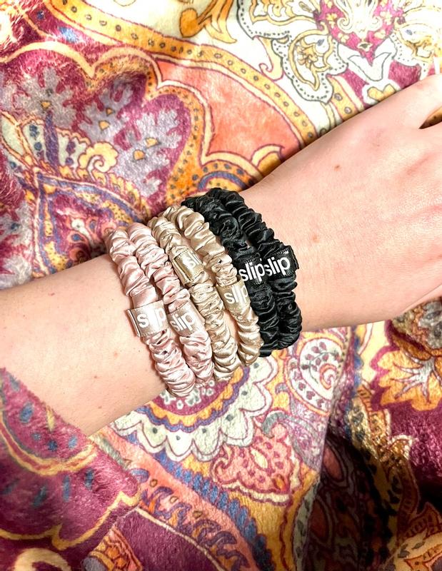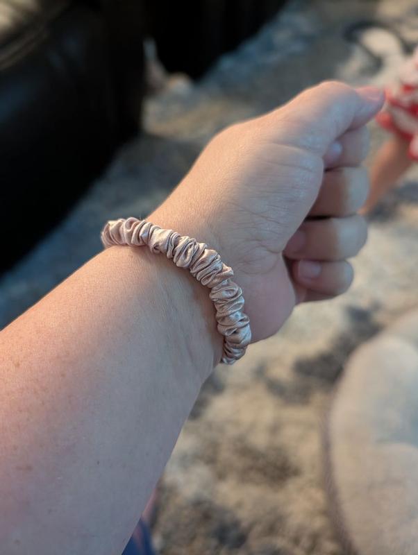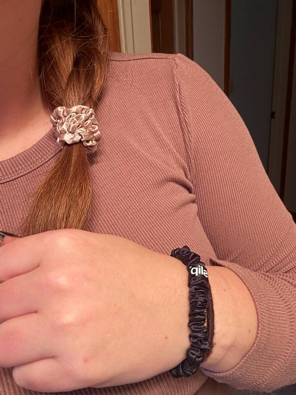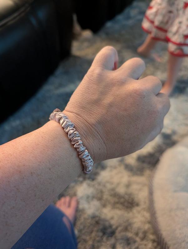 I am obsessed with these now. I love how gentle they are on my hair and how fashionable they are on my wrist. They are soft and stretchy and great for my long hair to prevent breakage.