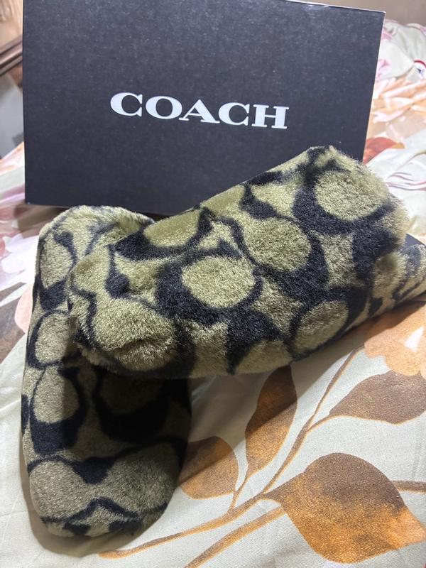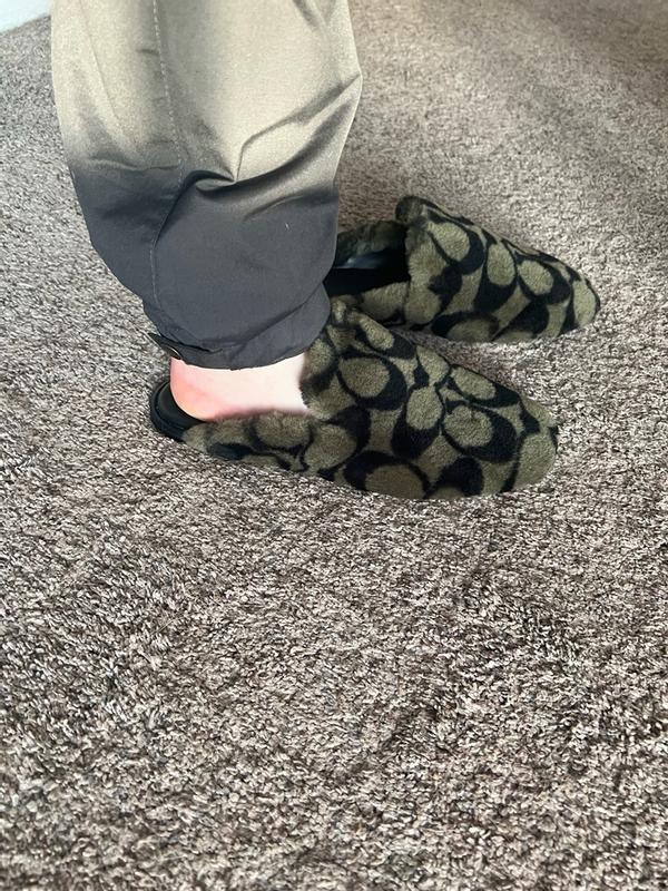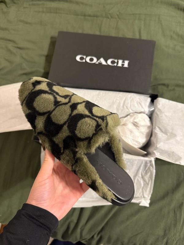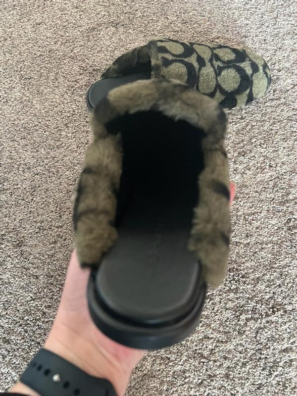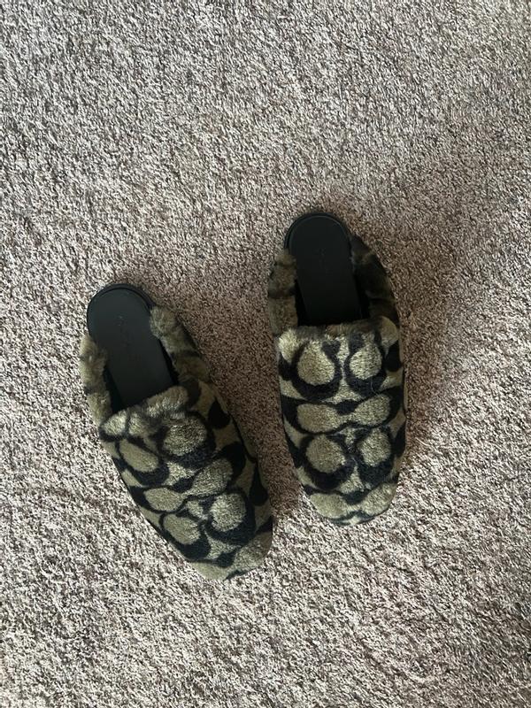 these Coach slipper are gorgeous! they’re a beautiful green. the fur is beautiful and soft. light weight shoe that resembles a sandal. i think this would be great for the fall/spring.
