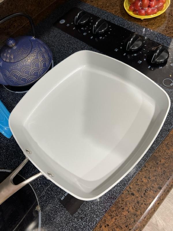 This has now become a go to pan when frying and sautéing in my kitchen. It works wonderfully to fry up burgers for my family while not having them stick to the pan. I would highly recommend. My only complaint is it’s not dishwasher safe that is something I look for when purchasing new pans but this is very easy to clean otherwise.