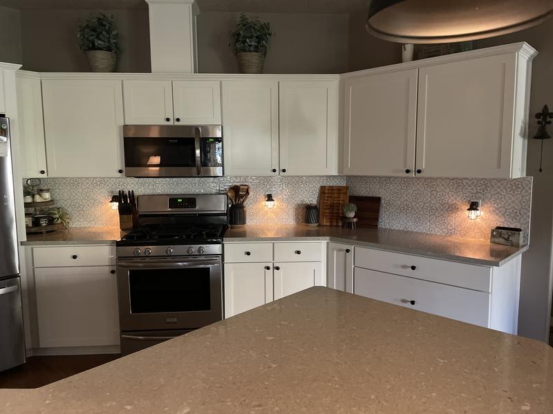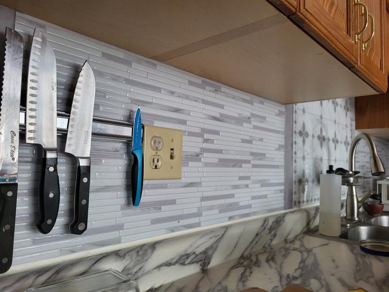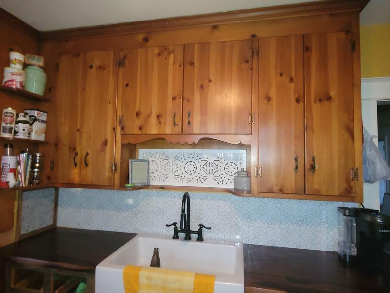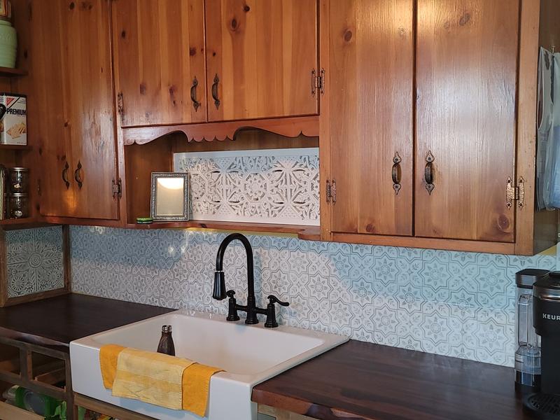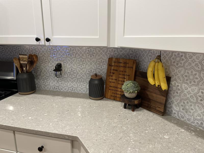 I was searching for something with more of a subdued pattern to use for my kitchen backsplash but didn't want to go with the simple subway tile look. I needed something that would compliment the vintage knotty pine cabinets and newly installed exotic butcher block countertop, instead of trying to complete with them. I found this and it looks great! Love the pattern and it was quick and easy to install!