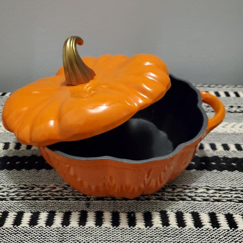 This is the cutest little enamel cast iron I have ever seen I am so excited to use this for years to come! I actually used it to bring over the family green bean casserole this year and it was a big hit. My family loved the look of the little pumpkin and it was fun that you could add a casserole to it put a lid on it and get going for the day it’s definitely a must have in my Fall decoration/cooking wear collection and I highly recommend for anyone that’s interested in something. That’s both cute and functional. It seemed to hold heat really well for it being more of a cast-iron Dutch oven type thing and I would highly recommend!!