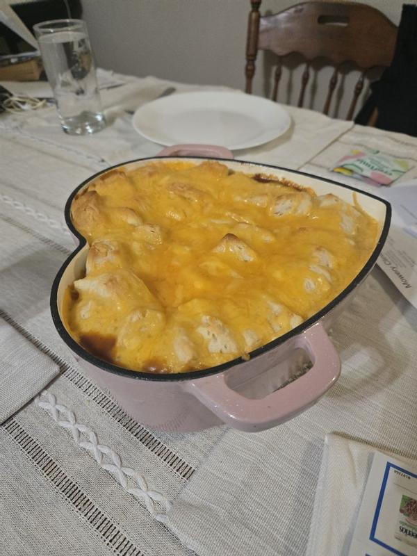 I love this little Dutch oven. I have yet to use it for cooking but it is lovely. It’s made out of cast iron, which is much better than nonstick. I’m thinking of making a pot pie for my husband for Valentine’s Day! It will be perfect!