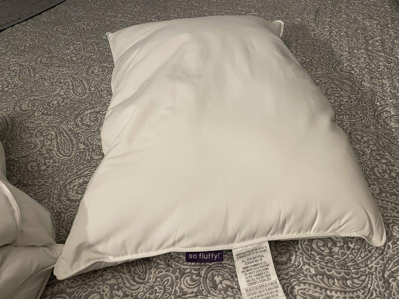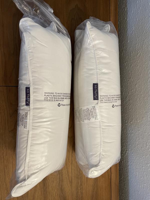 These pillows are exactly what they say they are so fluffy. We have been using them for a few weeks now and they are still nice and fluffed. They are not firm so if you prefer a firm pillow you probably won't like this one. They fit perfectly into a queen or king pillow case. The set is nice, soft and comfortable and provides me with a great night of sleep.