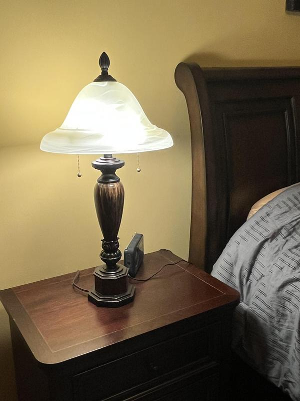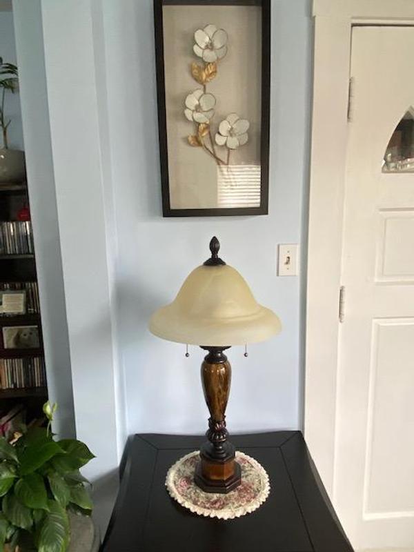 The lamp was as described. It was purchased to complement an antique round table that was recently refinished. Table with lamp sits next to a antique rocker in master bedroom for reading and utility uses. Great looking and functional lamp for reading or just adding additional light to a room. Too, I like the fact of using one or two lights being on to fit the occasion.