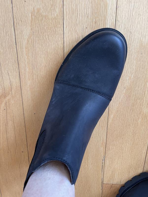 I almost returned these--they don't have much arch support and they were tight across the widest part of my feet (which are standard to narrow width). I changed my mind as I really needed a hardy pair of waterproof, all-around, slip on booties. The leather has stretched a bit and and they are not hard to get on/ off. While they don't have as much style as some other Sorels, they look good enough and go with most things. I'll probably need to get a different insole for them but for shorter term/lighter walking needs they are fine.