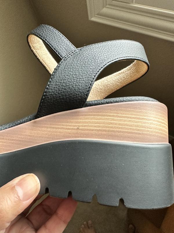 I am very pleased with this purchase as the sandal is stylish and comfortable. The wedge heel is not too high and walking is comfortable. I ordered wide width and my toes are not pinched by the strap. I bought two pair in black and the light blue .