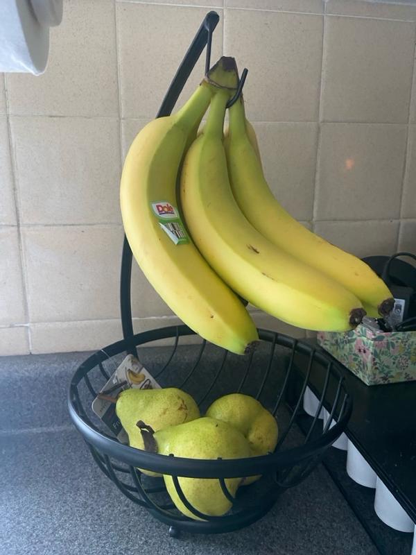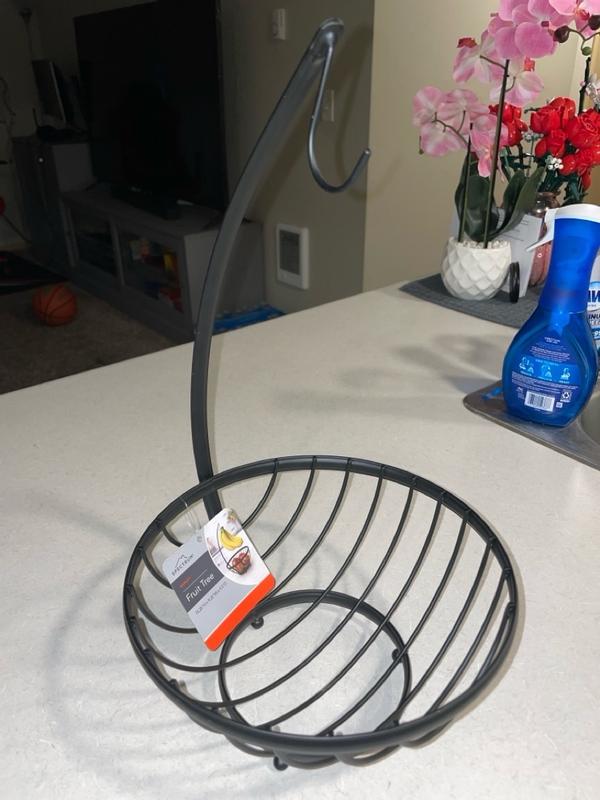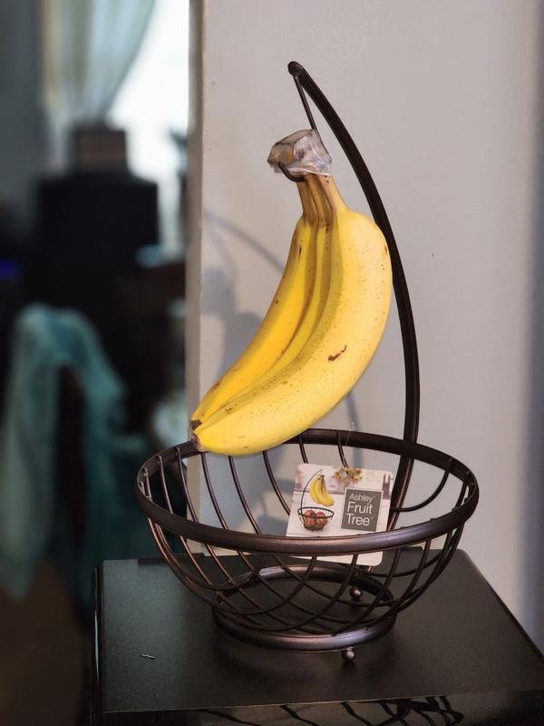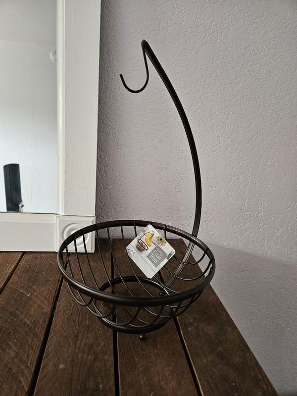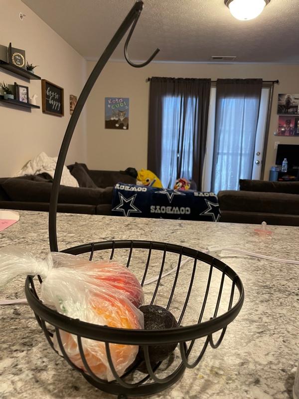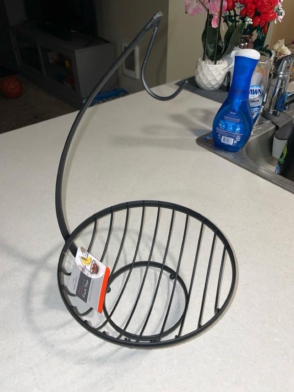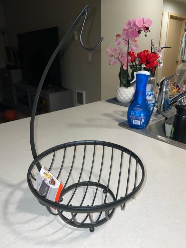 This wire metal fruit tree basket holder is great! It holds a ton of fruit in the basket as well as bananas on the hook. It’s lightweight and easy to move and lift. It’s also stylish and looks nice sitting on the counter.