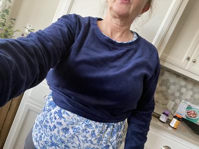 It’s very pretty soft and plush. Just understand that it’s a very short crop top. I’m 5’2” and this is how short it is on me. I couldn’t wear without a shirt under it. Sleeve length is great if you are average height or petite.