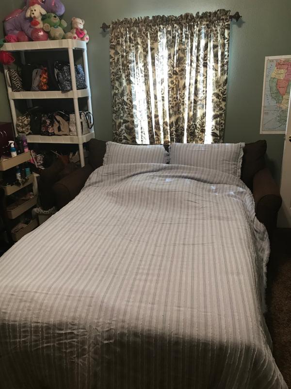 We love this comforter set. The light blue coloring is very peaceful. It’s very well made and very soft.