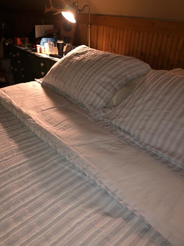We got this comforter for our beach residence, where it can get chilly at night. This comforter's "rustic" look fits in perfectly with our casual decor. The comforter is lofty and warm without being heavy and restricting. The cotton outer fabric is very soft and "comfy". The two shams add a very nice look to the bed.