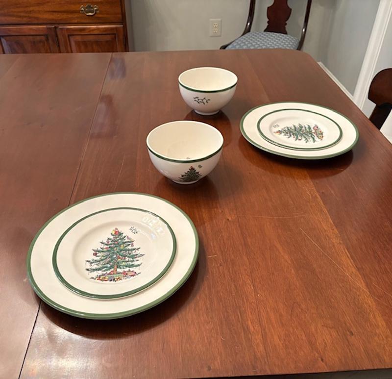 Celebrate the holidays in style with this gorgeous 12 piece Spode Christmas dinnerware place setting for four. Almost everyone knows the high quality craftsmanship that Spode is known for and this set is no exception. It will work perfect for our small family of four gathering. Spode has been around for over 250 years originating in England and this special Christmas Tree design was first produced in 1938