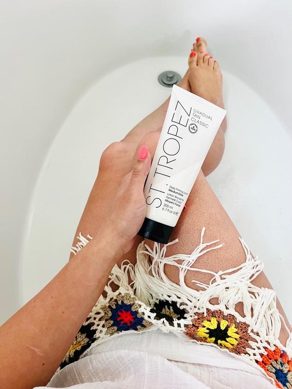 THIS product definitely needs more recognition!! 👏🏻 🤩 Self tanners and spray tans are a girl’s best friend all year long 💁🏻♀️, especially going into the summer months. I’m no exception to that, so I was excited to try this “Classic Gradual Tan” tinted moisturizer, compliments of St. Tropez. 🙏🏻 I 💯 can say my skin is more hydrated, there’s no doubt there. I’m also loving that I can control my tinted glow on an as need basis. And you don’t turn into an orange!! I learned a little of this product goes a looong way!!!! This gentle tanning moisturizer is very simple and easy to use. Suitable for all skin tones, it is perfect for anyone looking for a subtle glow they can add into their daily routine, maintain their tan, or are new to tanning. Simply reapply daily to build your desired glow.