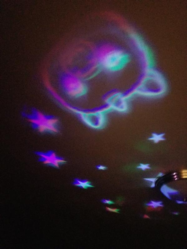 This really is as cut. It's cuddly, and the projector is really effective. The lights are quite bright regardless of which color you set for the lights. I like the 20 minute automatic shut-off feature, too.
