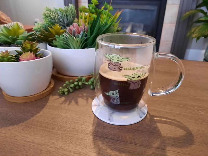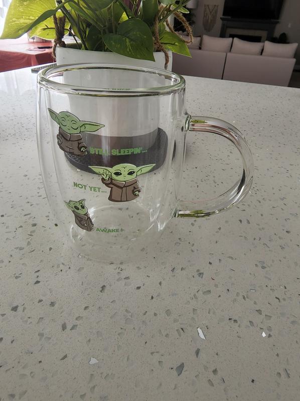 Ok I am OBSESSED!!!!!! Baby yoda is the cutest character out there. And these cups are no exception to my collection. They are super cute and I love that it can be used for hot or cold drinks. Only reason why this isn’t a 5 star review is because they are sensative. Put a fork inside while taking the cup to the sink. As I was washing dishes, I noticed that the glass broke on the bottom. Super sad but at least I have one left