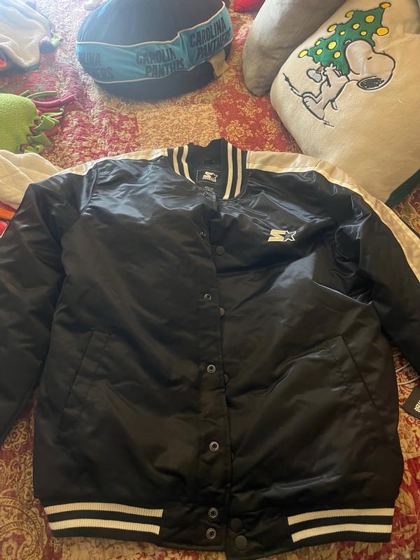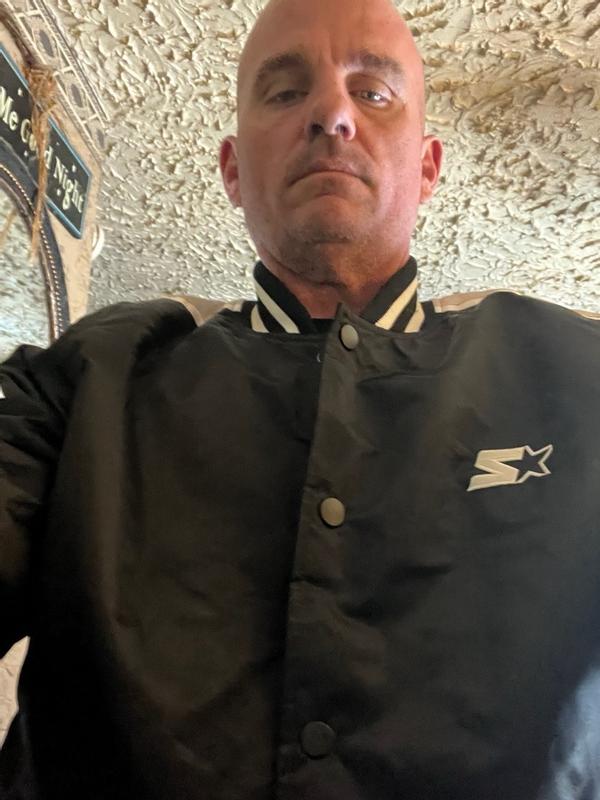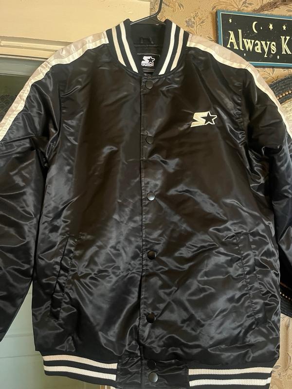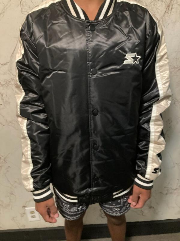 Has this satin appearance with the classic snap button closure. Relaxed fit. The overall black has cream & white detail and interior pockets on each side.