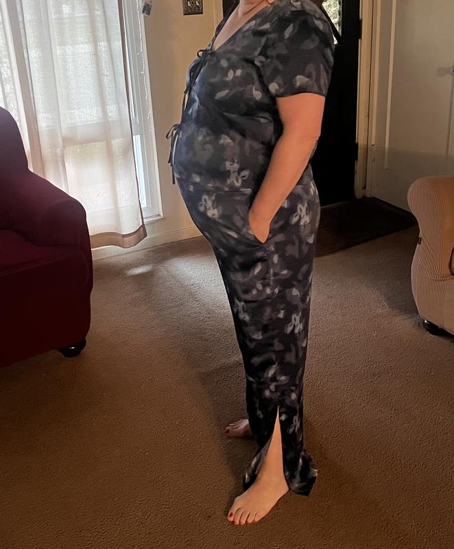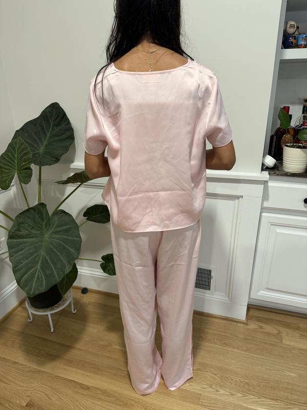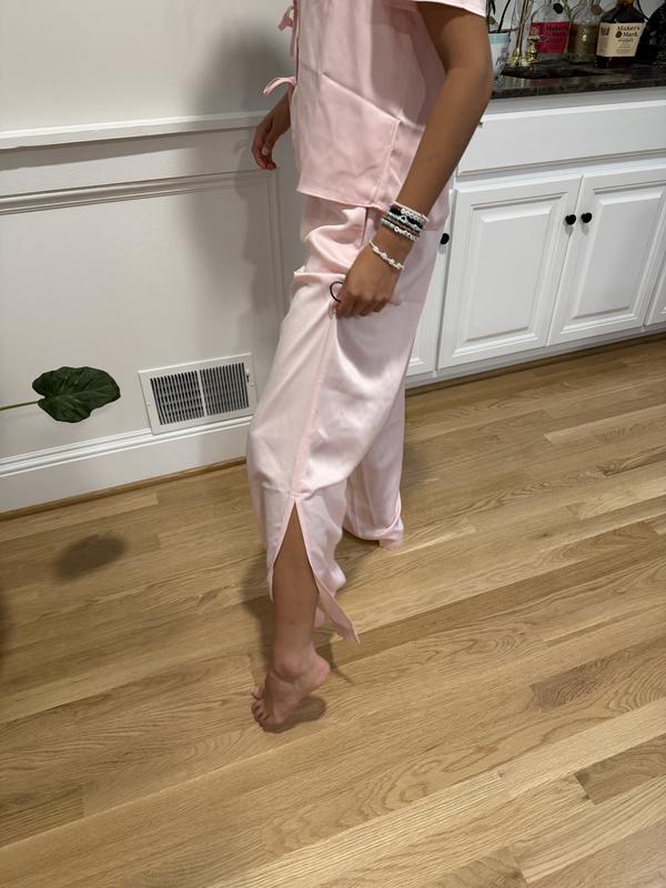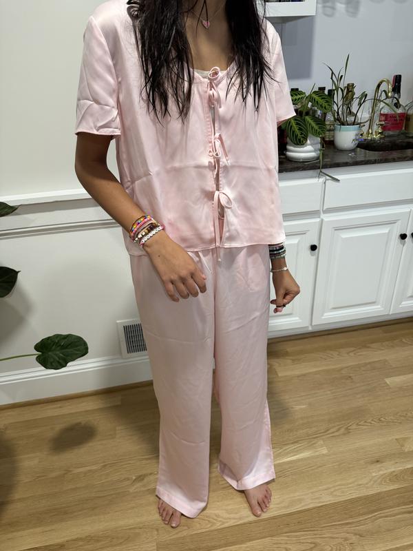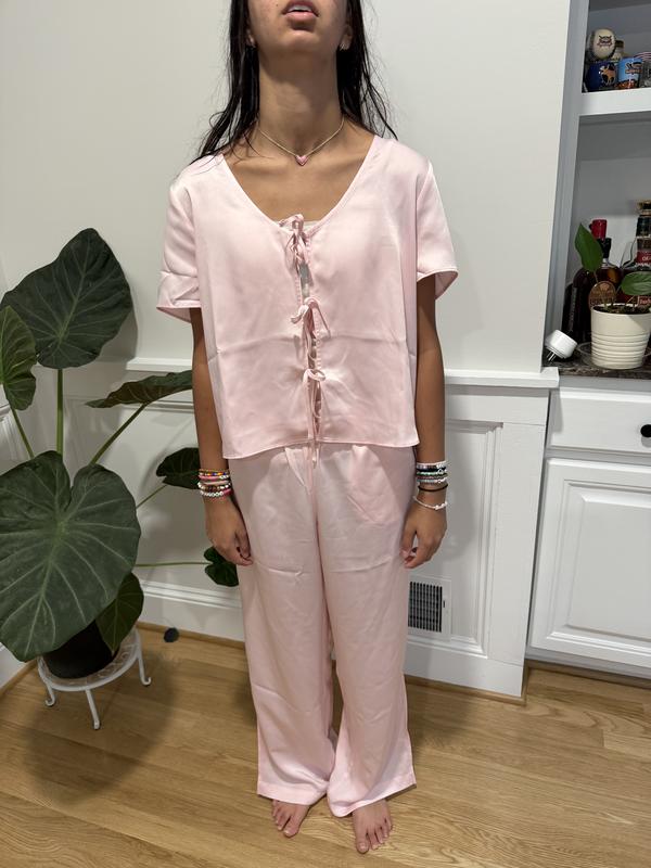 These were a cute pair of pajamas but the material was very thin. Even if they were pajamas, they need to be thicker so they aren't as see through. The pants needed a drawstring as they are very loose at the waist. The top is cute but you definitely have to wear a top under with the whole tie front design. The slit in the pants in cute. Very soft material!
