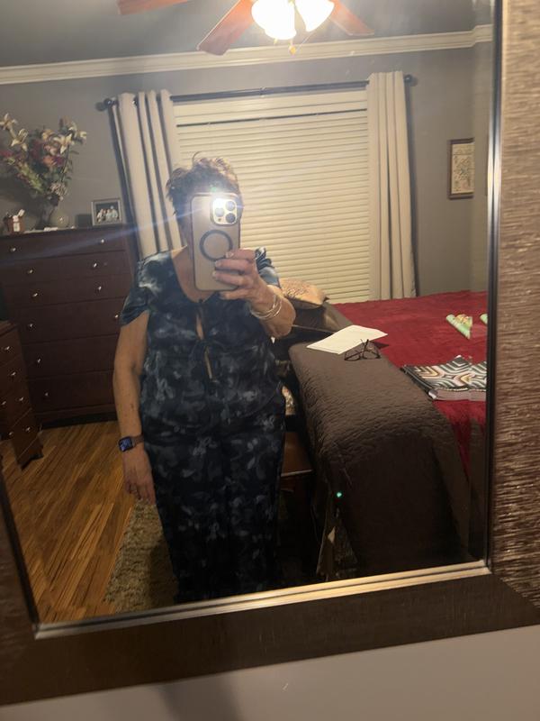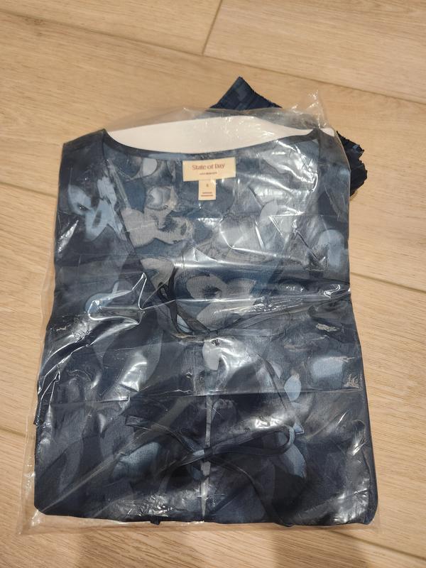 The State of Day Tie Front Crepe de Chine Pajama Pant Set is made of soft 100% recycled polyester. The leopard print is muted. The set came out of the washer and dryer with no wrinkles. The top fit well but the pants were too long. There is a split on the outside of each pant leg. The tie front top did not stay tied during the night.