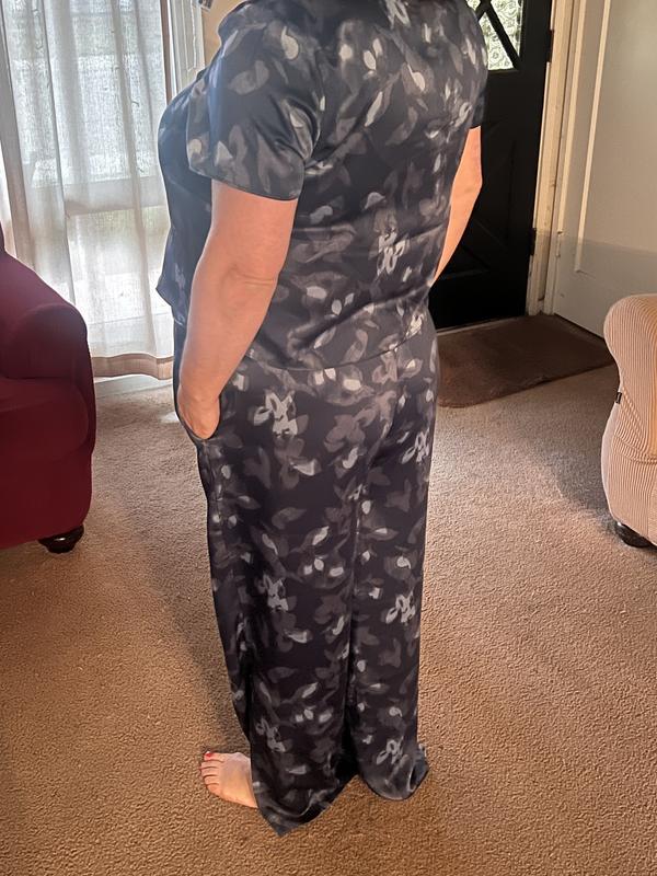 These pajamas were very comfortable to wear. The blue floral pattern is absolutely gorgeous, and the silk-like material felt great against my skin. They were a bit longer than I prefer, but the side leg slit added nice breathability and comfort while sleeping. I also appreciated the front ties, which made it easy to adjust the fit.
