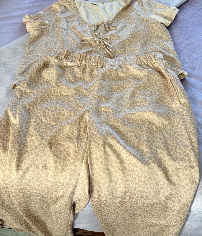 This is a very pretty cheetah-print nightwear set. I love the material, but I’m not a big fan of the open tie detail on the top. Overall, it’s very comfortable and the pajamas look lovely. It's more for summer nights
