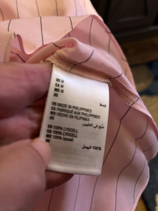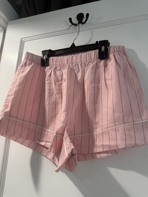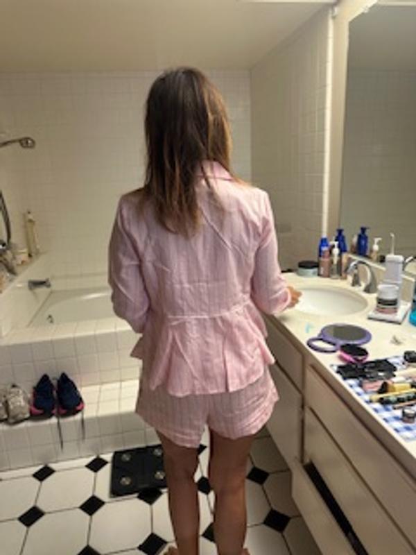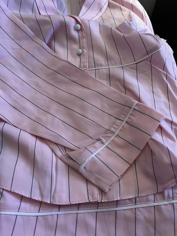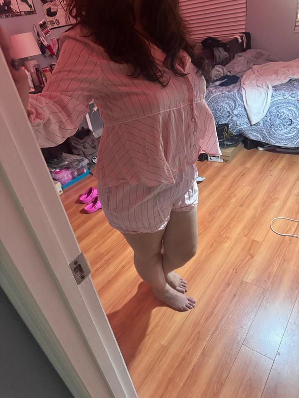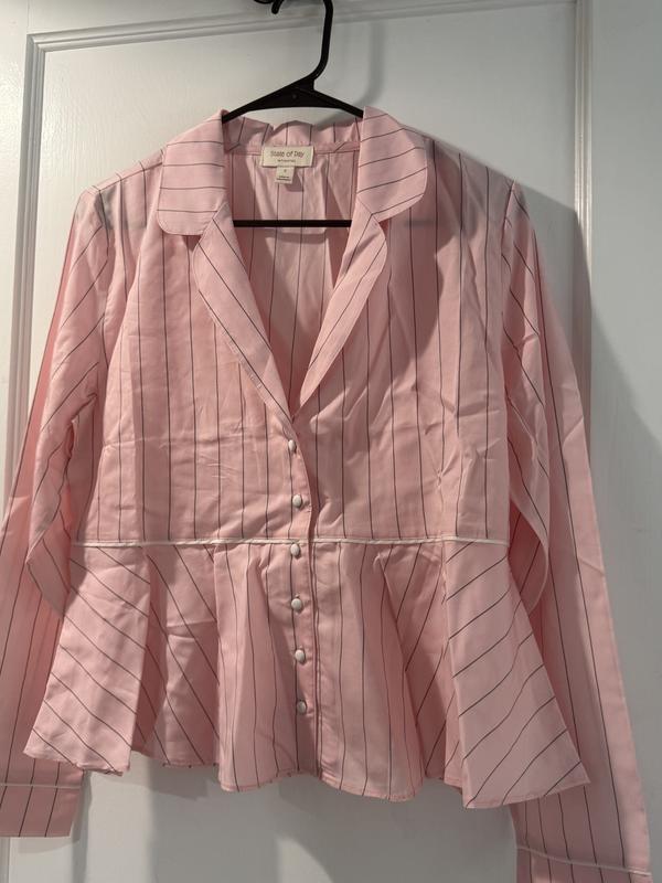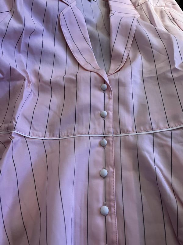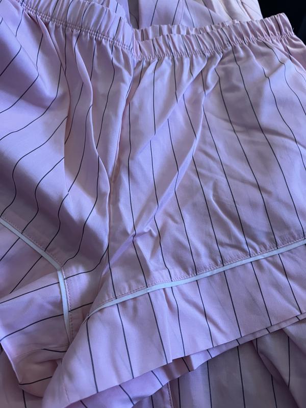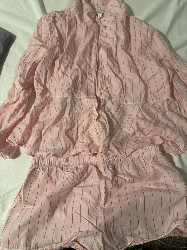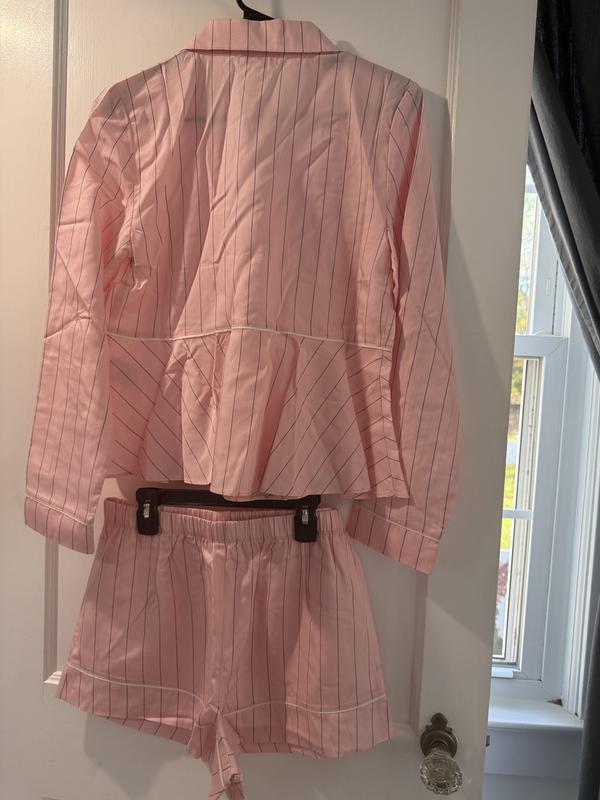 Adorable pajama set! I love the light pink color and the pinstripe detail on the pajamas. The top is a peplum style, which makes it different than any other nighttime set I’ve seen. The material is light, and the fit is loose and comfortable. I’ll be wearing this to bed for the foreseeable future!