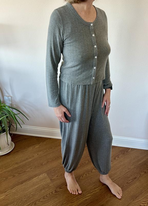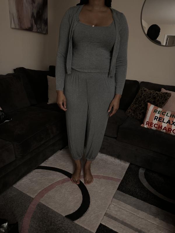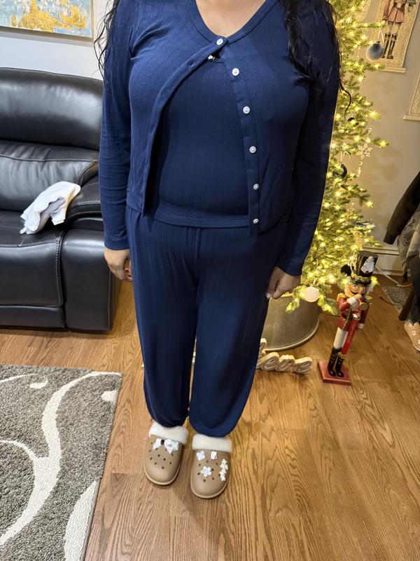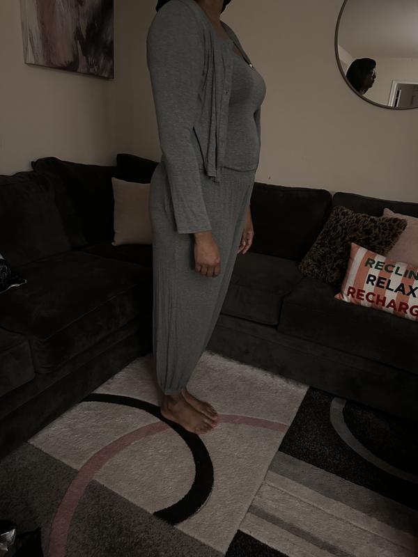 This 3 piece pajama set is cute, comfy and functional. I love wearing the cardigan while I’m finishing up my night routine, and I just toss it aside before I climb into bed. The pants are very soft, with an elastic waistband and elastic bottom. The best part- it has pockets! It has a nice feminine touch with a little rose on the neckline.